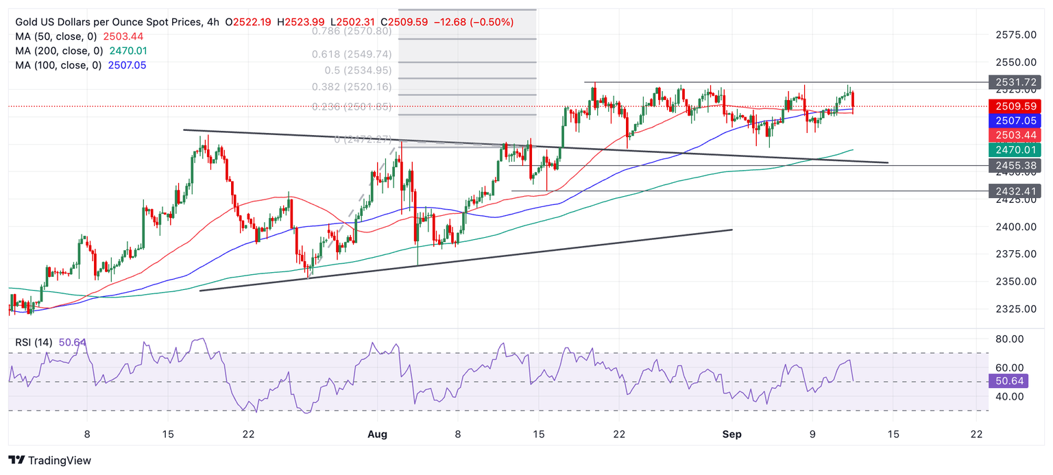 El Oro (XAU/USD) toca el techo de su rango y luego vuelve a caer hasta los 2.500$ tras la publicación de los datos de inflación de EE.UU. el miércoles.