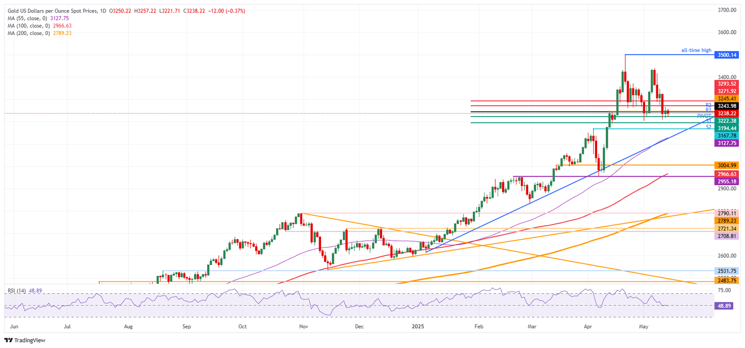 El Oro (XAU/USD) retrocede a 3.235$ el miércoles mientras que lo peor de la presión de venta parece haber pasado debido a un Dólar estadounidense (USD) más débil. La lectura de inflación más baja de lo esperado para abril publicada el martes, dio un impulso a los mercados para dirigirse hacia activos de riesgo, ya que el temido choque inflacionario por los aranceles aún no se ha materializado. La lectura más baja de lo esperado tanto para el índice general mensual como para los componentes básicos impulsó un repunte de alivio en las acciones y llevó a los inversores a incorporar más recortes de tasas de la Reserva Federal (Fed) para este año.