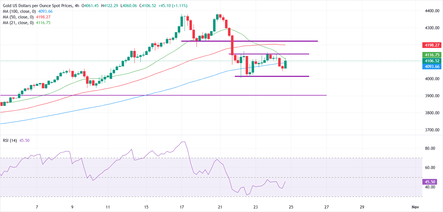 El XAU/USD muestra signos tempranos de consolidación tras un fuerte repunte. Las perspectivas a corto plazo se han vuelto bajistas ya que el metal ahora se cotiza por debajo de las medias móviles simples (SMA) de 21, 50 y 100 períodos en el gráfico de 4 horas, señalando un debilitamiento del impulso alcista.