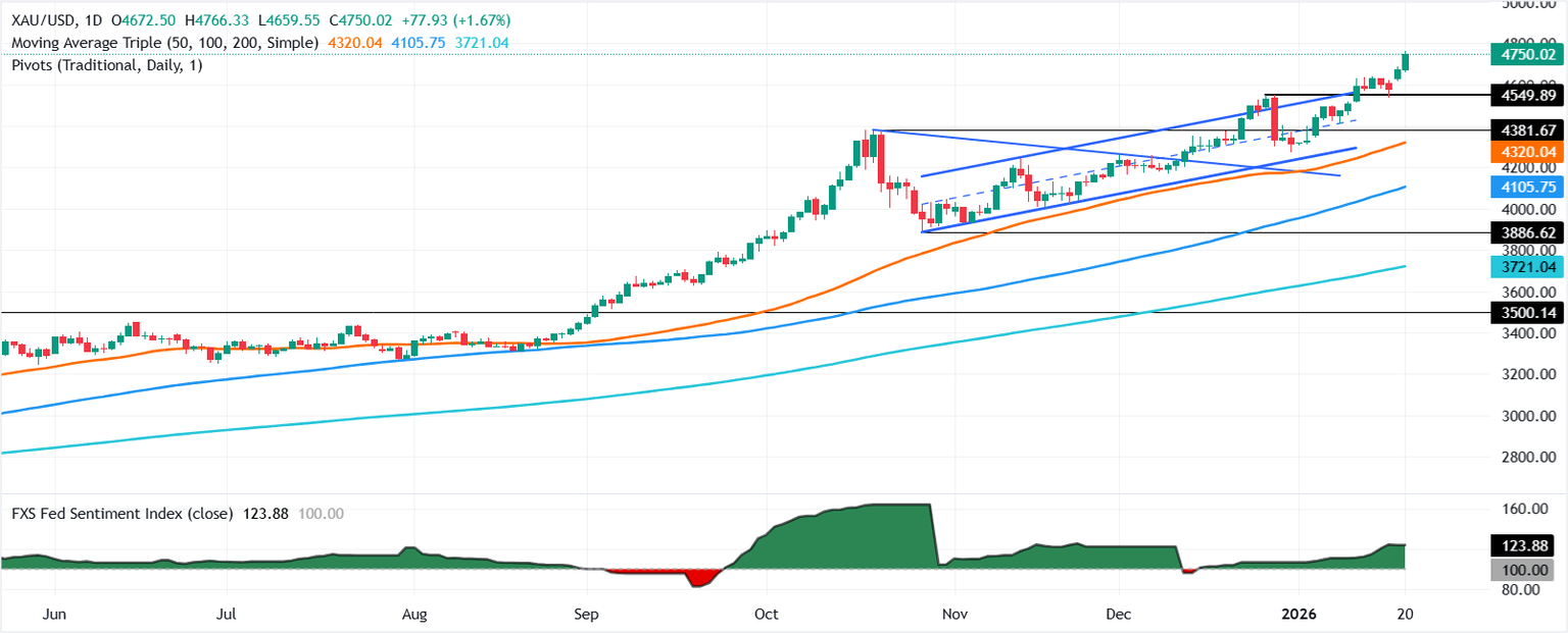 El precio del Oro (XAU/USD) se recupera por encima de 4.750$ a un nuevo máximo histórico cerca de 4.766$ el martes en medio de la escalada de tensiones geopolíticas, incluida la guerra comercial entre EE.UU. y la Unión Europea, junto con el repentino aumento de los rendimientos de los bonos globales, tras una "débil subasta de deuda a 20 años más temprano en el día", según Bloomberg. Al momento de escribir, el XAU/USD cotiza a 4.758$, con un aumento de más del 3.50% en el día.