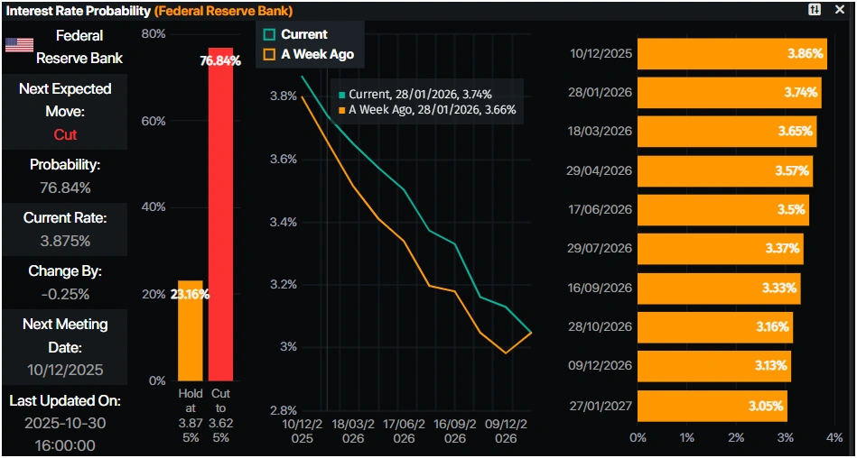 - Para la reunión de diciembre, las expectativas de que la Reserva Federal recortara tasas están en 76%, bajando del 85% antes de la decisión de la Fed, según datos de Prime Market Terminal.