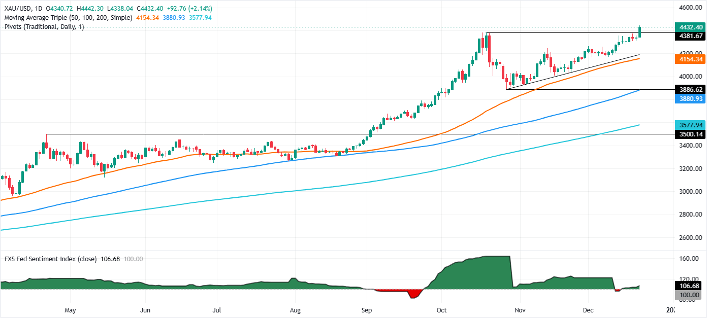 - El Dólar estadounidense más débil y la caída de los rendimientos de los bonos del Tesoro de EE.UU. apoyan al oro mientras los mercados valoran 59 puntos básicos de flexibilización de la Fed en 2026.
