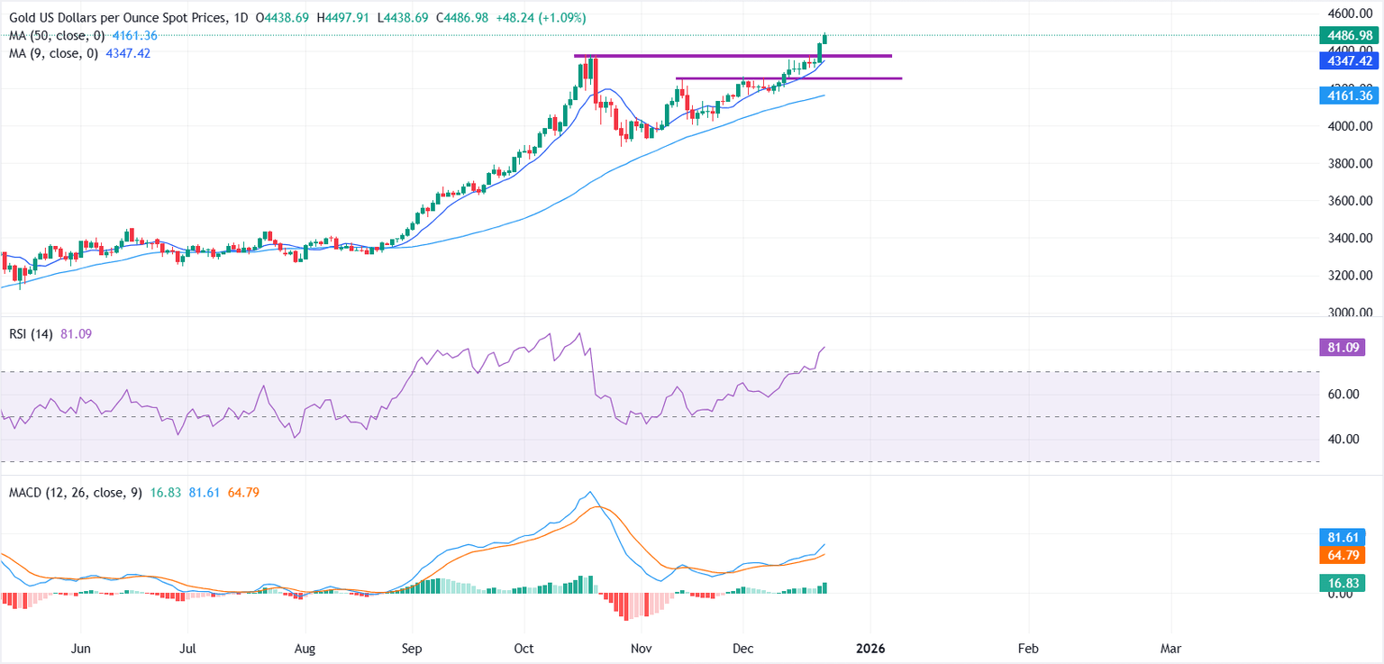 El último aumento también refleja un reposicionamiento de fin de año a medida que los mercados se dirigen hacia el largo período de vacaciones. Si bien algunas tomas de ganancias en niveles elevados podrían desencadenar una consolidación a corto plazo, la tendencia más amplia sigue siendo constructiva, con el Oro en camino a su mejor rendimiento anual desde 1979, con un aumento de casi el 70% en lo que va del año.