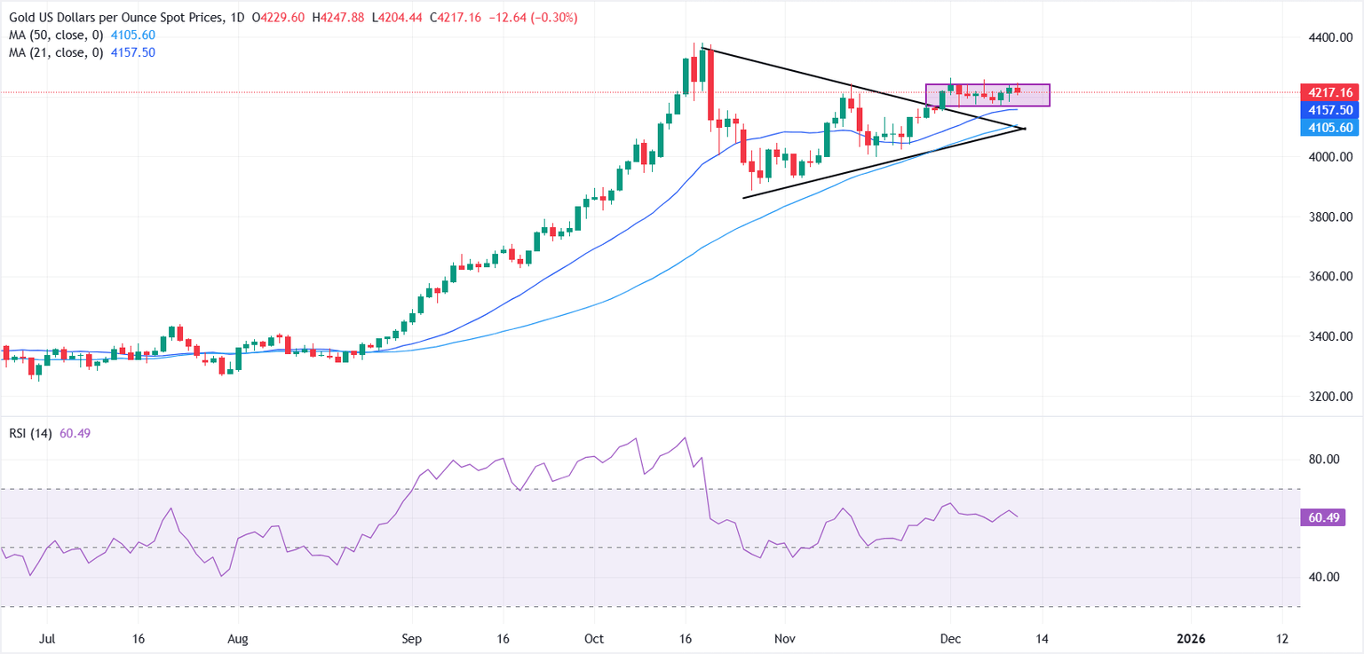 Los comentarios de Powell fueron ampliamente interpretados como una confirmación de que la Fed está adoptando un enfoque de espera tras haber realizado recortes de tasas de 75 pbs este año. Aun así, los responsables de la política siguen divididos sobre la necesidad de un alivio adicional en 2026, dejando a los inversores inciertos sobre el camino de la política y manteniendo al metal precioso confinado al rango familiar que ha dominado el comercio durante más de una semana.