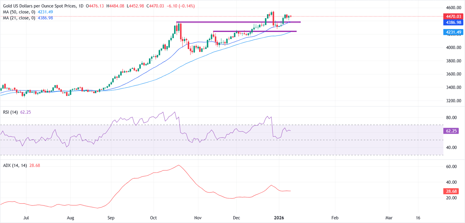 A la baja, 4.400-4.380 marca la primera zona de soporte clave. Una ruptura por debajo de esta área expondría la SMA de 50 días cerca de 4.231, abriendo la puerta a un retroceso más profundo.