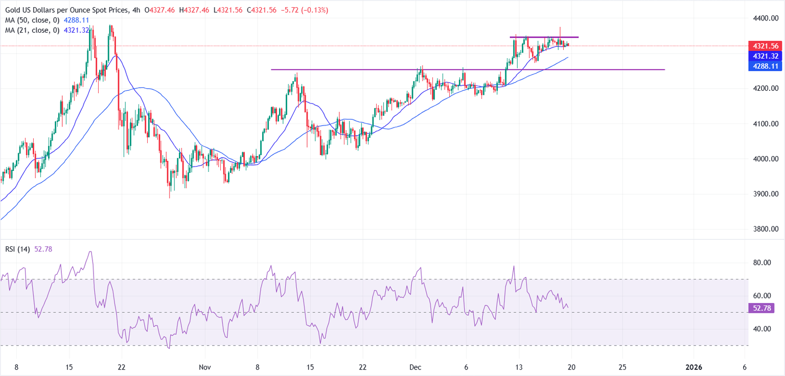 Una ruptura sostenida por debajo de la SMA de 21 podría exponer la SMA de 50 períodos cerca de 4.320$, con un retroceso más profundo abriendo la puerta hacia la región de 4.250$, una zona de soporte clave a corto plazo.