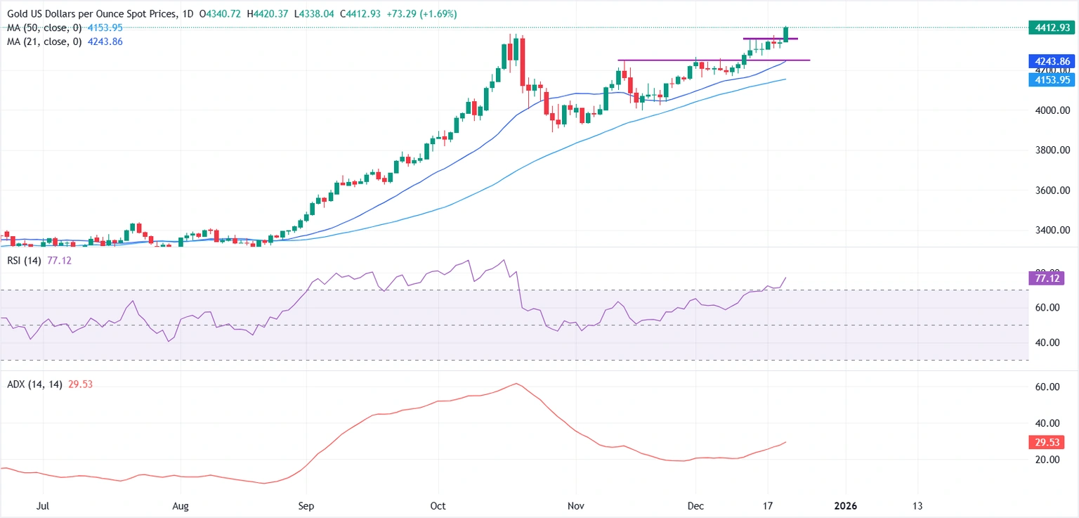 A medida que los mercados se acercan al final del año y la liquidez se reduce con la escasez de grandes datos, el Oro puede consolidarse a corto plazo o ver una leve toma de ganancias después del reciente repunte antes de intentar otro empuje hacia territorio inexplorado.