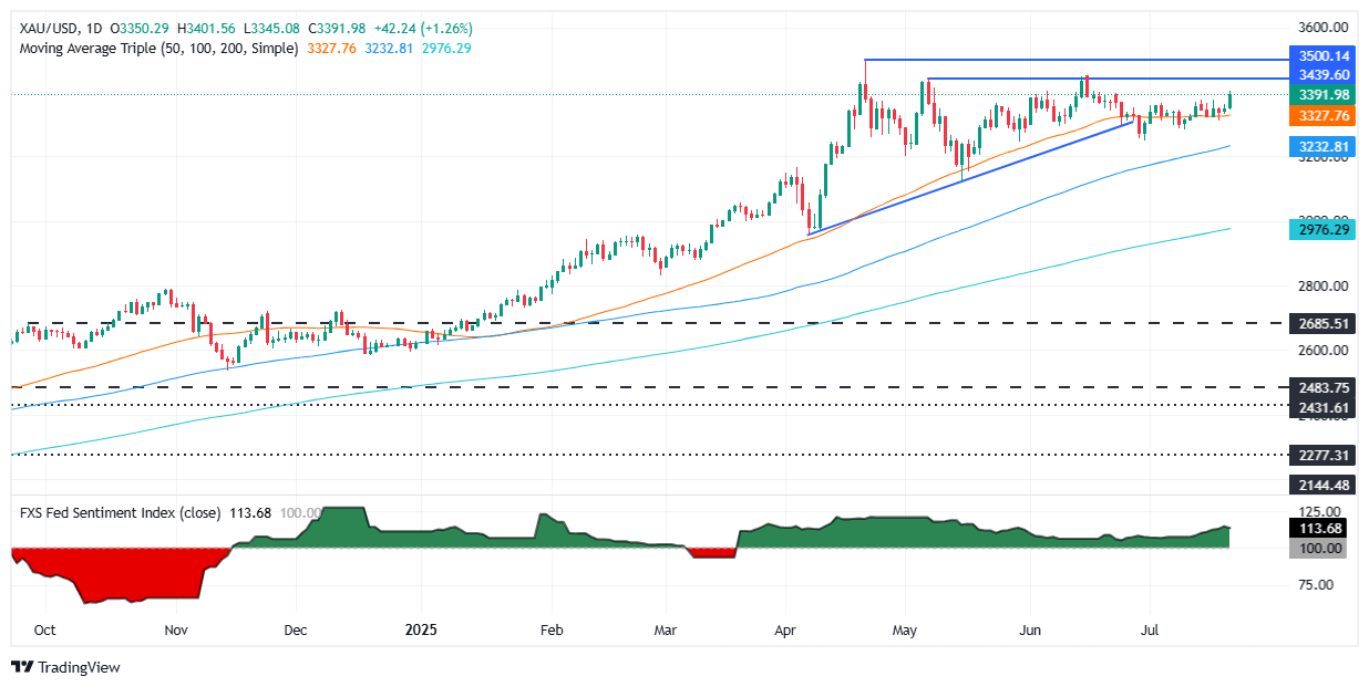 El precio del Oro se disparó más del 1% el lunes mientras el Dólar estadounidense y los rendimientos del Tesoro de EE.UU. cayeron drásticamente en medio de la incertidumbre sobre los acuerdos comerciales, en un ambiente general de apetito por el riesgo en los mercados. En el momento de escribir, el XAU/USD cotiza a 3.397$ después de rebotar desde mínimos diarios de 3.338$.