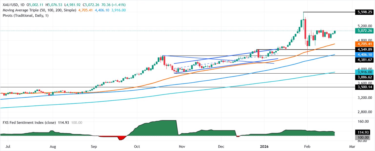 Por el contrario, si el Oro se mantiene alrededor de 5,000$-5,050$, podría permanecer en un rango mientras los operadores esperan más catalizadores. Sin embargo, una caída por debajo de la parte inferior del rango expondría el mínimo diario del 17 de febrero en 4,841$, seguido por la media móvil simple (SMA) de 50 días en 4,681$.
