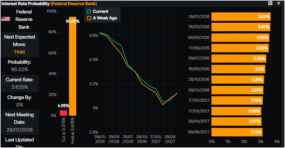- Dado el contexto, los inversores han descontado 56 puntos básicos de recortes de tasas por parte de la Reserva Federal en 2026, según datos de Prime Market Terminal.