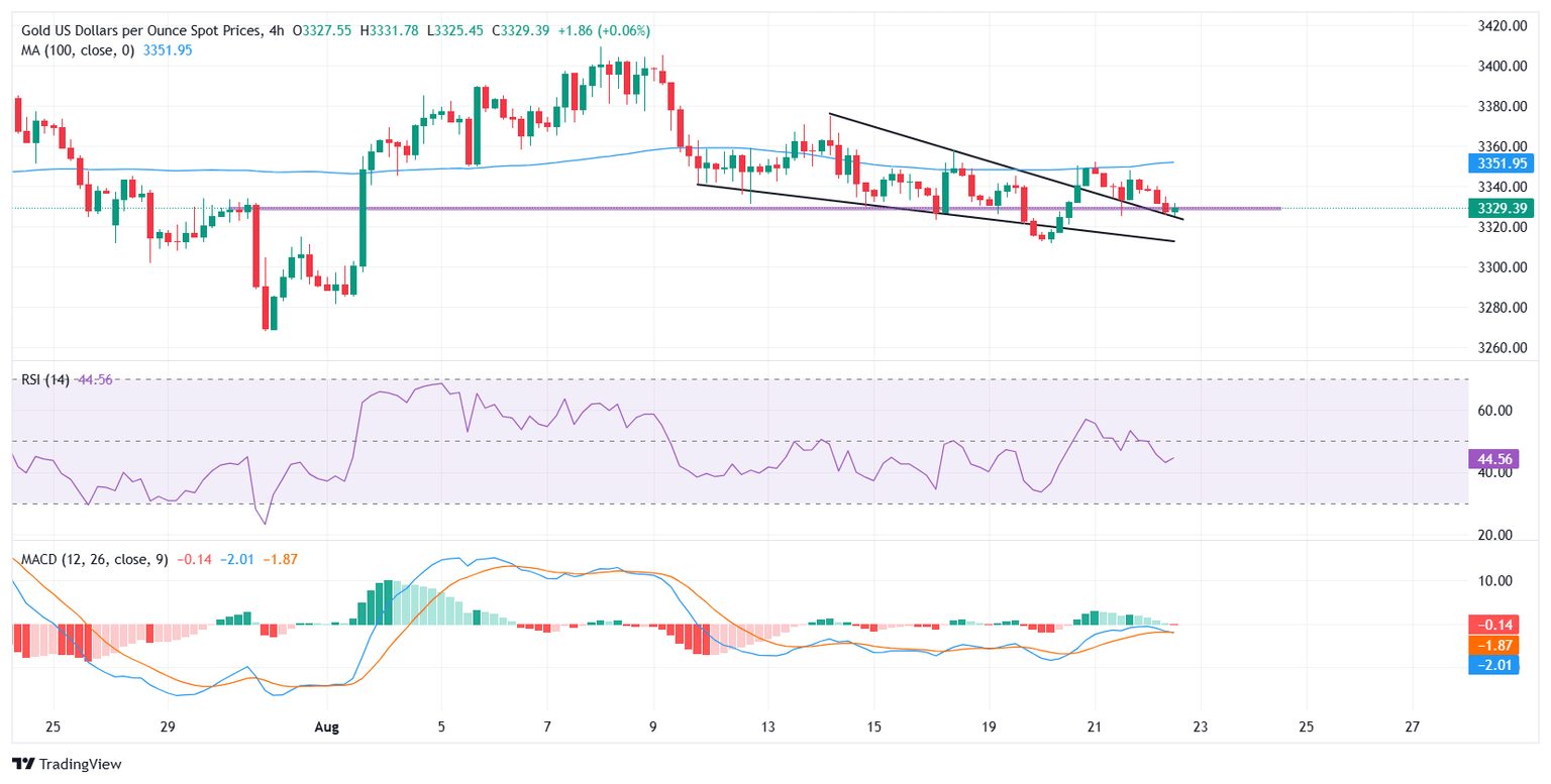 El Oro (XAU/USD) está cotizando cerca de 3.330$, probando un área de soporte horizontal pivotal que se alinea con el límite superior de un patrón de cuña descendente en el gráfico de 4 horas. Esta zona se ha convertido en la línea de defensa inmediata para los compradores.