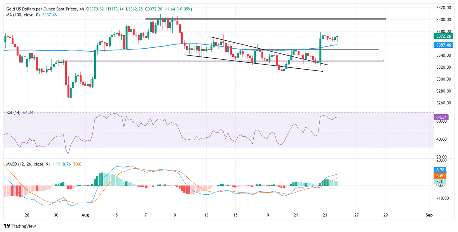 El XAU/USD confirmó una ruptura del patrón de cuña descendente en el gráfico de 4 horas la semana pasada, volvió a probar la resistencia rota y luego se disparó a un máximo de dos semanas de 3.378$ el viernes. El movimiento validó la estructura de reversión alcista y destacó el renovado interés comprador tras un período de consolidación. Al momento de escribir, el metal se cotiza cerca de 3.370$, manteniéndose por encima de la media móvil de 100 períodos en 3.357$, que actúa como soporte inmediato.