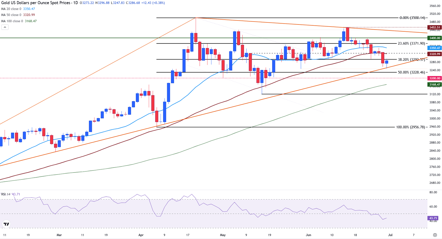 El indicador del Índice de Fuerza Relativa (RSI) en el gráfico diario está actualmente apuntando hacia abajo, cerca de 44, indicando un aumento del impulso bajista sin haber entrado aún en territorio de sobreventa. Un cierre diario por debajo de 3.228$ podría abrir la puerta hacia la SMA de 100 días en 3.168$, mientras que se necesitaría un empuje sostenido por encima de 3.292$ para cambiar el sentimiento a corto plazo de nuevo al alza.