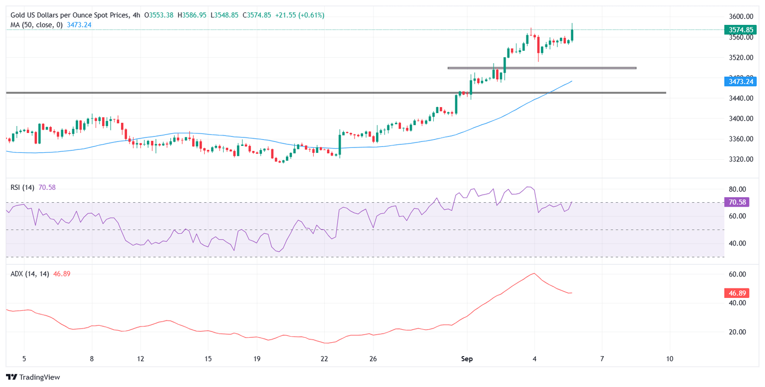 XAU/USD imprimió un nuevo máximo histórico de 3.586$ el viernes antes de suavizarse ligeramente, y ahora se está consolidando justo por debajo de los máximos récord alrededor de 3.575$. La acción del precio sugiere una digestión saludable de las ganancias, con el metal amarillo manteniéndose cómodamente por encima de la media móvil simple (SMA) de 50 períodos en el gráfico de 4 horas en 3.473$, que actúa como una fuerte base de soporte.