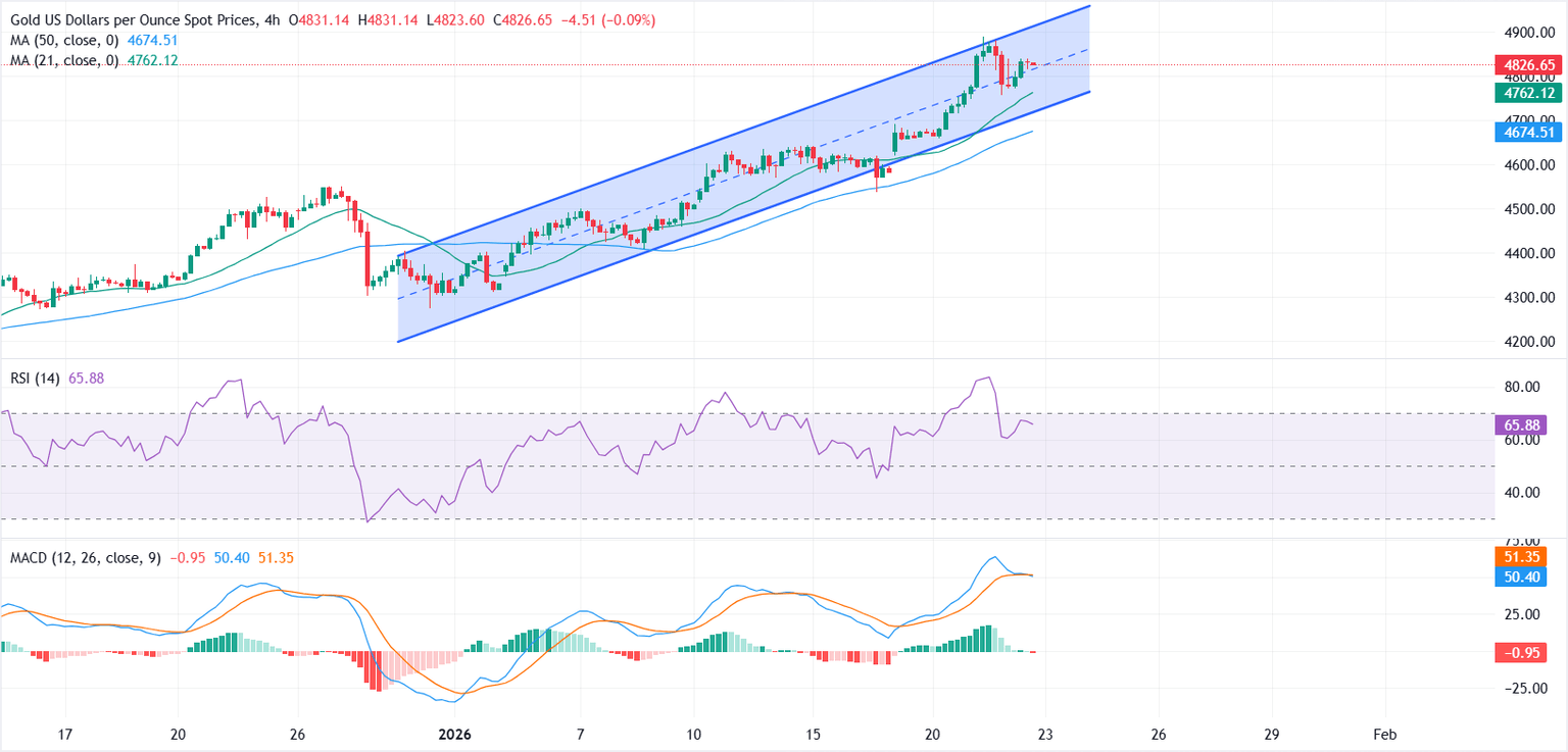El XAU/USD se mantiene en una fuerte tendencia alcista, con precios que han subido casi un 11% hasta ahora este mes tras un aumento de aproximadamente el 64% en 2025. En el gráfico de 4 horas, el Oro se está negociando dentro de un canal paralelo ascendente bien definido, marcado por una clara secuencia de máximos y mínimos más altos. Los precios se mantienen cómodamente por encima de las medias móviles simples (SMA) de 21 y 50 períodos, reforzando la visión de que los compradores están firmemente al mando.