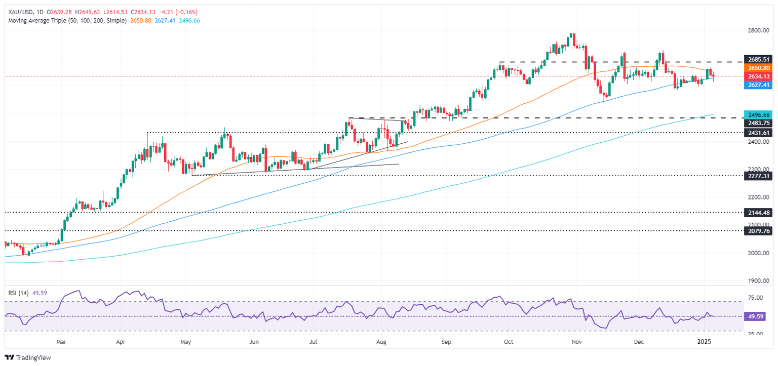 El precio del oro terminó 2024 atrapado en el rango de 2.600$ - 2.620$ en medio de un Dólar estadounidense robusto por los temores de la agenda de Trump. Sin embargo, el metal sin rendimiento ha roto la parte superior de ese rango, lo que abrió la puerta para que el XAU/USD intercambie manos en torno al nivel de 2.630$ - 2.650$, con la media móvil simple (SMA) de 50 días rondando los 2.652$.