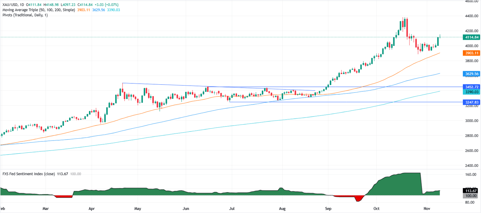 - Los rendimientos de los bonos del Tesoro de EE.UU., con el rendimiento del bono a 10 años, se mantienen firmes en 4.12% mientras el mercado de bonos permanece cerrado en observancia del Día de los Veteranos. Los rendimientos reales de EE.UU. — que correlacionan inversamente con los precios del oro — están en 1.83%.