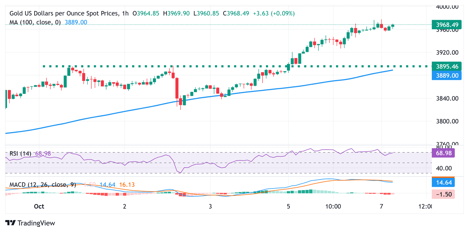 El Oro (XAU/USD) se mantiene estable cerca de un nuevo máximo histórico alcanzado durante la sesión asiática del martes y parece estar preparado para seguir subiendo en medio de un trasfondo fundamental favorable. Las expectativas de que la Reserva Federal de EE.UU. (Fed) reducirá los costos de endeudamiento dos veces más este año no ayudan al Dólar estadounidense (USD) a atraer compradores significativos y continúan actuando como un viento de cola para el metal amarillo sin rendimiento. Aparte de esto, el cierre del gobierno de EE.UU. mantiene la demanda de lingotes de refugio seguro en juego en medio de crecientes tensiones comerciales y geopolíticas.