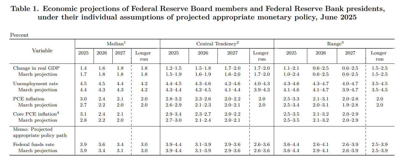 El SEP reveló que los funcionarios de la Fed esperan que el Producto Interno Bruto (PIB) de 2025 sea ligeramente inferior al 1.7% de marzo, bajando al 1.4%, y que la tasa de desempleo suba una décima al 4.5%. La inflación subyacente del PCE se revisó al alza del 2.8% al 3.1%, y la tasa de fondos federales se mantuvo sin cambios en 3.9%. Esto sugiere que los responsables de políticas están considerando dos recortes de tasas de 25 puntos básicos este año.