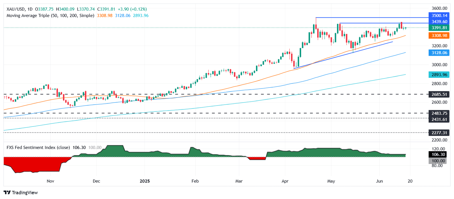 El precio del Oro se mantiene firme cerca de 3.390$ ya que la Reserva Federal decidió mantener las tasas sin cambios en la reunión del 18 de junio. El Resumen de Proyecciones Económicas (SEP) revela que los funcionarios aún están considerando 50 puntos básicos de alivio en 2025. Al momento de escribir, el XAU/USD cotiza con pérdidas mínimas del 0.08%.