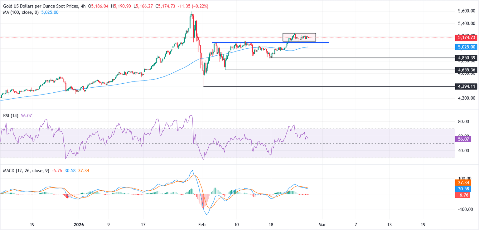 El gráfico de 4 horas muestra que el XAU/USD está formando una base por encima del nivel de 5.100$. El sesgo a corto plazo parece ligeramente bajista a neutral, aunque la tendencia alcista más amplia se mantiene intacta, ya que los precios continúan imprimiendo una secuencia de máximos y mínimos más altos desde que tocó fondo cerca de 4.400$ tras la fuerte corrección desde los máximos históricos alrededor de 5.598$.