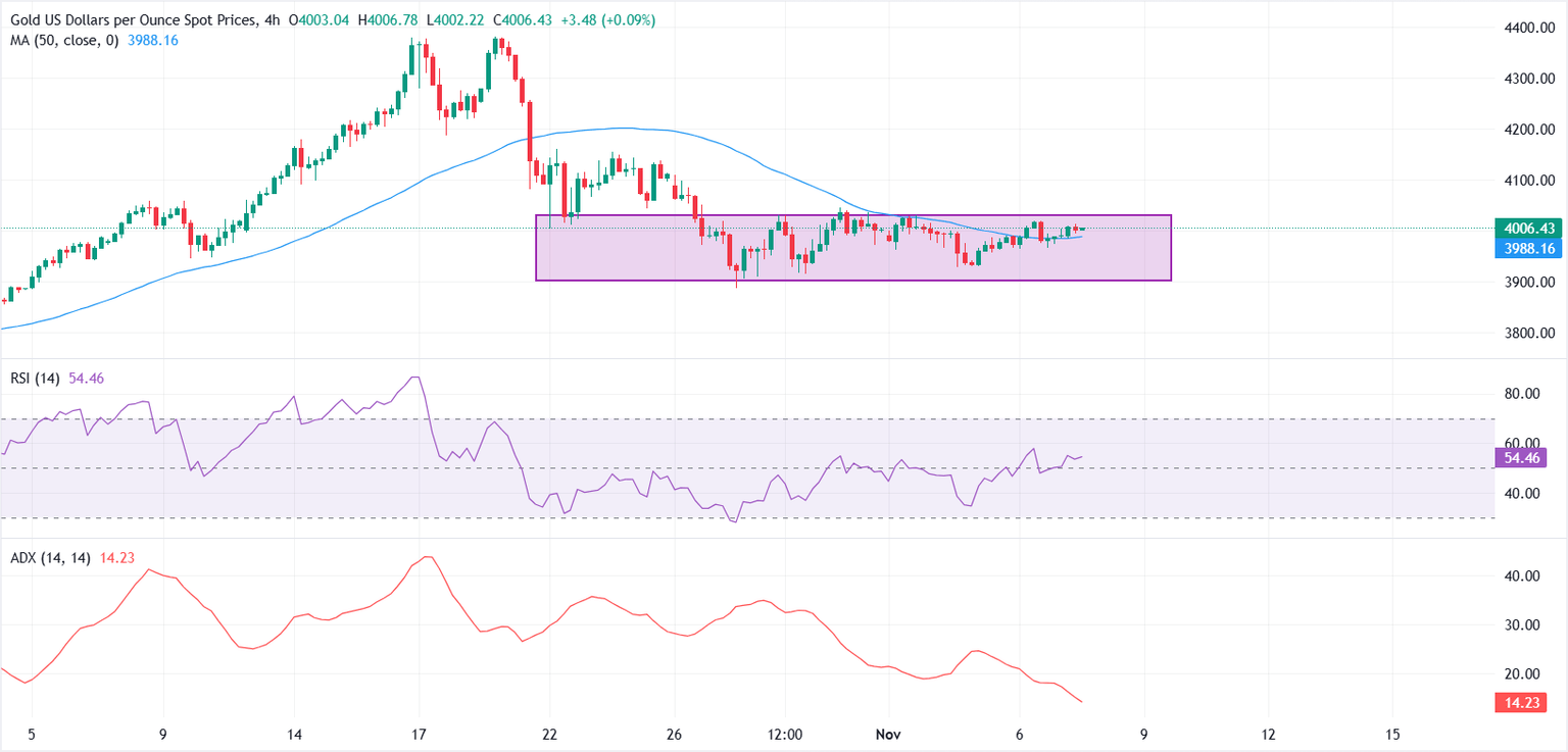 El XAU/USD continúa negociándose en un rango ajustado, con la acción del precio en gran medida confinada entre 3.900$ y 4.050$ durante casi dos semanas. En el gráfico de 4 horas, el comercio dentro del rango domina, ya que los intentos repetidos de romper por encima de la zona de 4.020$ a 4.050$ han encontrado una firme resistencia, mientras que la región de 3.900$ sigue ofreciendo una base sólida.