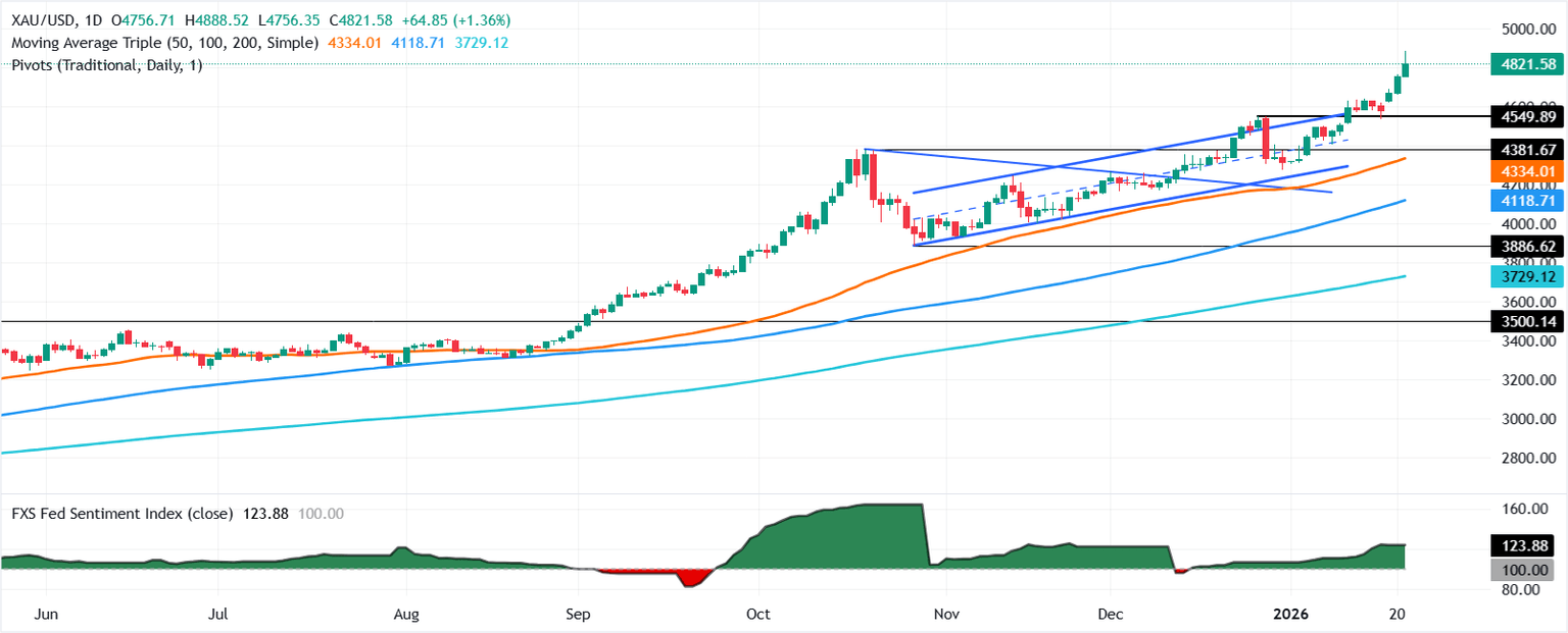 El precio del oro alcanzó un nuevo máximo histórico de 4.888$ antes de retroceder a los niveles actuales del precio al contado, pero la tendencia alcista se mantiene intacta. Los alcistas están ganando impulso, como lo indica el Índice de Fuerza Relativa (RSI), que, a pesar de no superar el último pico como lo ha hecho la acción del precio, su pendiente apunta hacia arriba como indicación de fuerza a pesar de estar en territorio de sobrecompra.