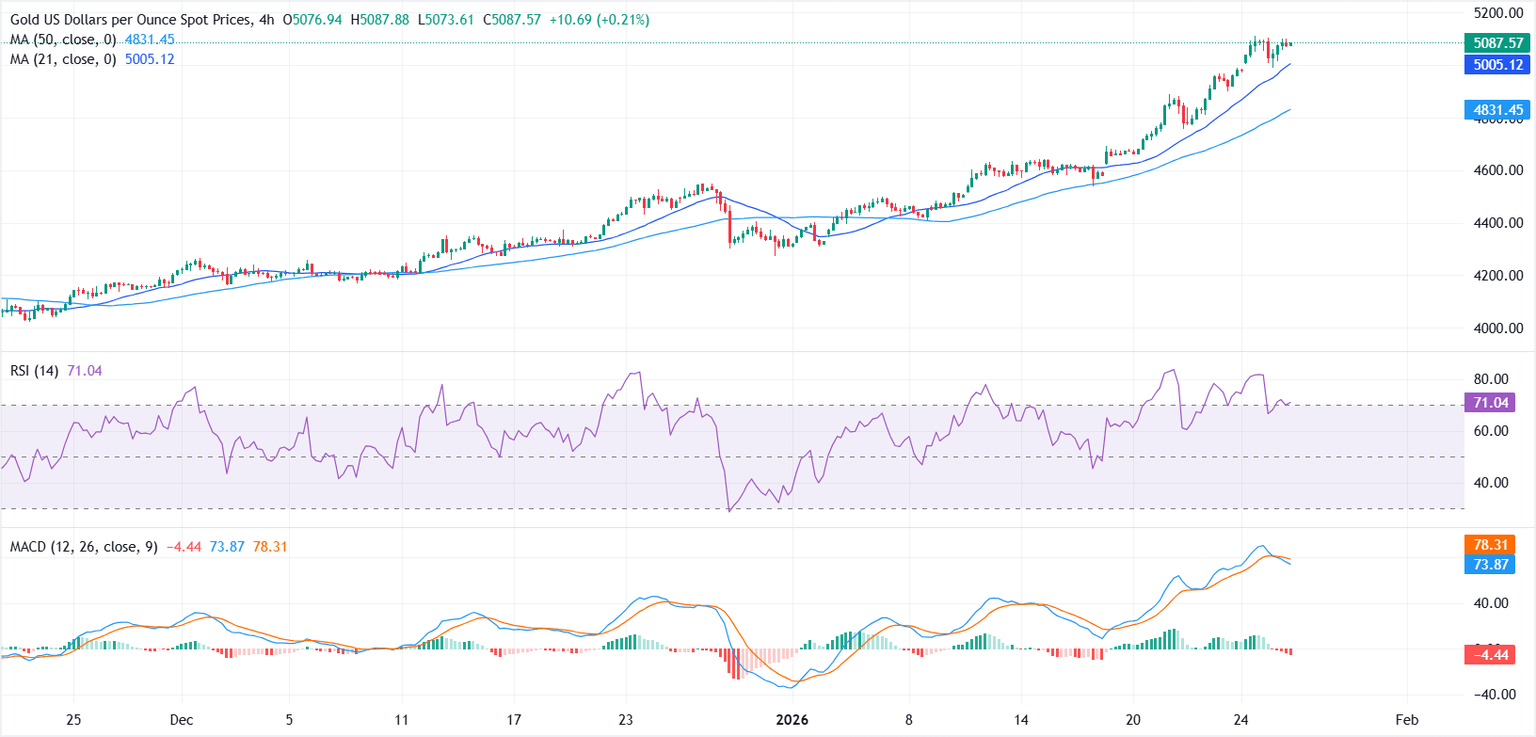 Si bien los mercados de acciones de EE.UU. han permanecido resilientes hasta ahora, las crecientes preocupaciones sobre valoraciones estiradas mantienen frágil el sentimiento de los inversores. Al mismo tiempo, los temores de otro cierre del gobierno de EE.UU. están aumentando, con los legisladores enfrentando un plazo de financiación el 30 de enero. En este contexto, el oro sigue atrayendo flujos defensivos.