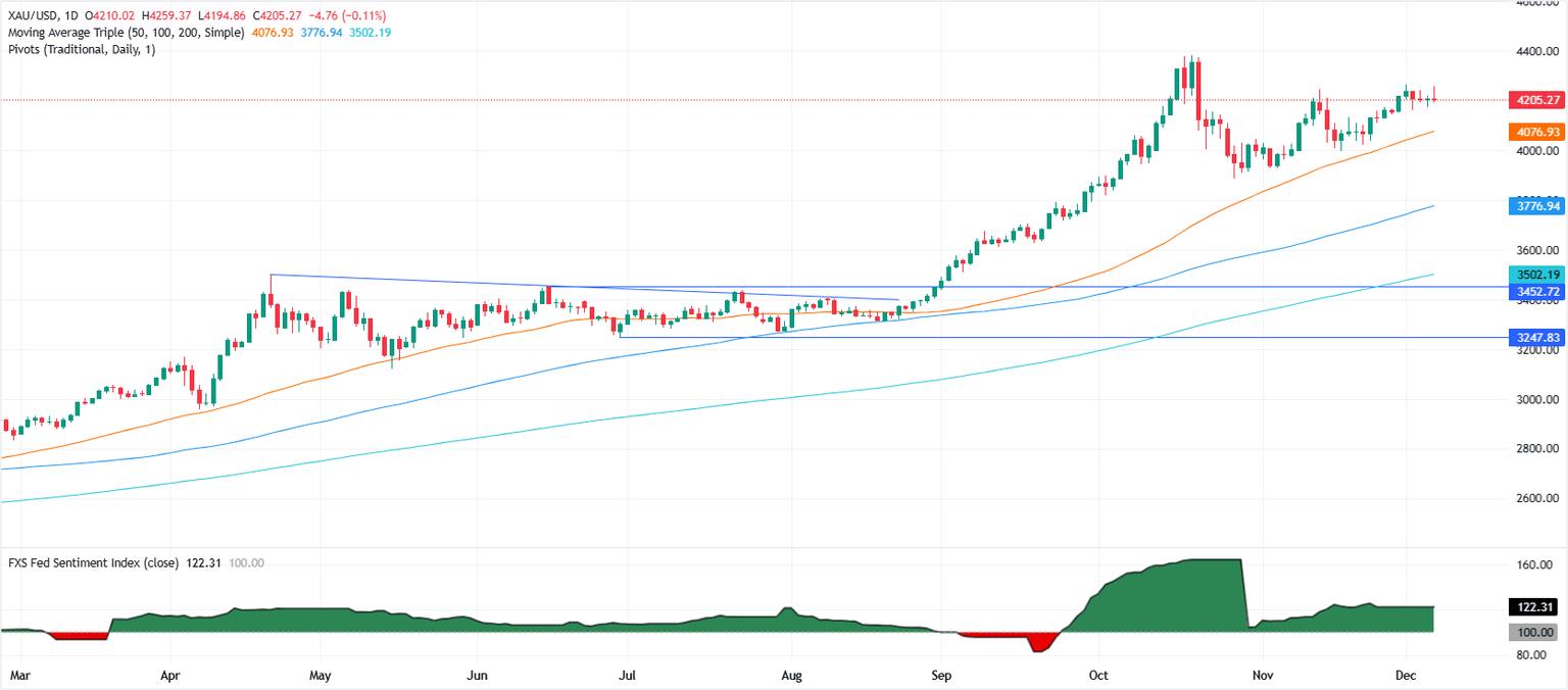 - El Oro se consolida en el rango de $4,200-$4,250 antes de la clave reunión de la Fed.
