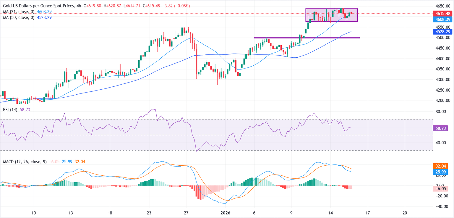 Desde un punto de vista técnico, el XAU/USD parece estar entrando en una fase de consolidación cerca de máximos históricos, con la acción del precio limitada entre la zona de 4.580$-4.640$. Las condiciones de sobrecompra están desalentando a los compradores de perseguir agresivamente más ganancias por ahora, incluso cuando la estructura más amplia sigue siendo firmemente alcista.
