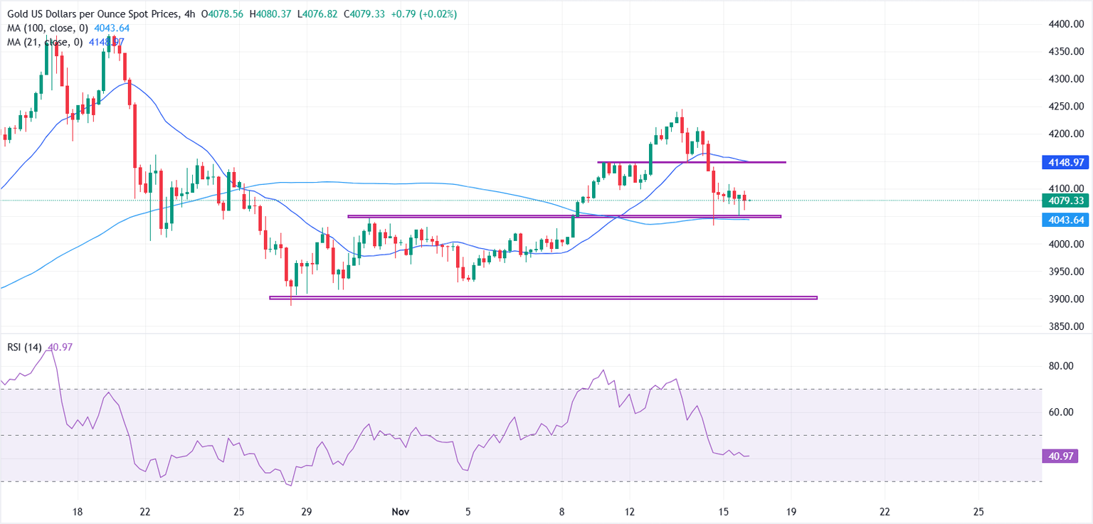 La perspectiva a corto plazo para el Oro parece estar en un rango, con el gráfico de 4 horas mostrando un soporte repetido alrededor de la SMA de 100 períodos cerca de 4.043$. Este nivel también se alinea estrechamente con el límite superior de la zona de consolidación anterior, reforzando su importancia como un área de soporte fuerte.