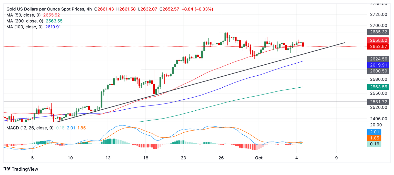 El Oro retrocede ligeramente desde el suelo del rango de 2.638$ (mínimo del 3 de octubre) y una línea de tendencia importante: un cierre por debajo de estos niveles de soporte volvería la tendencia a corto plazo más bajista y aumentaría las probabilidades de más caídas. Gráfico de 4 horas del XAU/USD