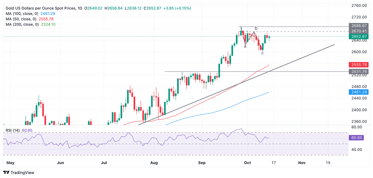 El Oro se detiene después de rebotar tras el final de un retroceso. El metal precioso parece reanudar su tendencia alcista dominante después de que una corrección de tres ondas (abc) concluyera en los mínimos del 10 de octubre.