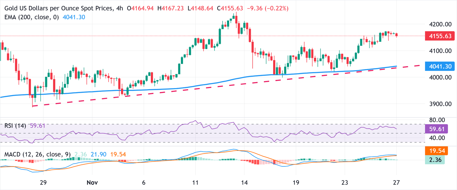 El Oro (XAU/USD) se mueve a la baja durante la sesión asiática del jueves y se aleja de un máximo de casi dos semanas, alcanzado el día anterior, aunque la caída parece limitada. Las perspectivas de tasas de interés más bajas en EE.UU., junto con las esperanzas de un acuerdo de paz entre Rusia y Ucrania, siguen apoyando el optimismo del mercado. Esto, a su vez, se considera que está impulsando algunos flujos alejados del oro refugio en medio de volúmenes de negociación reducidos debido a la festividad de Acción de Gracias en EE.UU.