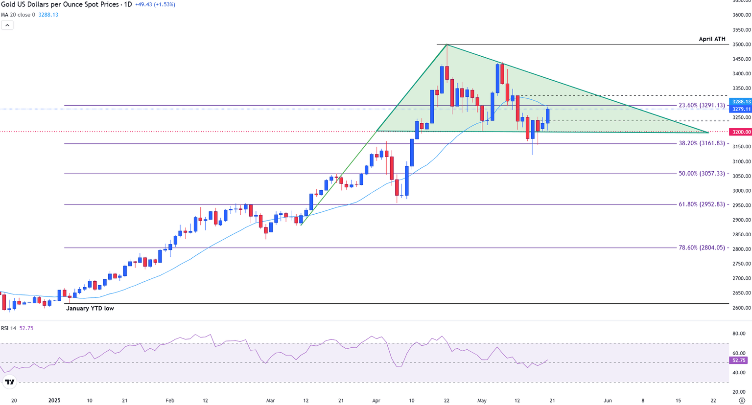 El precio se está acercando tanto a la media móvil simple (SMA) de 20 días en 3.288$ como al nivel de retroceso de Fibonacci del 23.6% del movimiento de YTD de enero a abril en 3.291$.