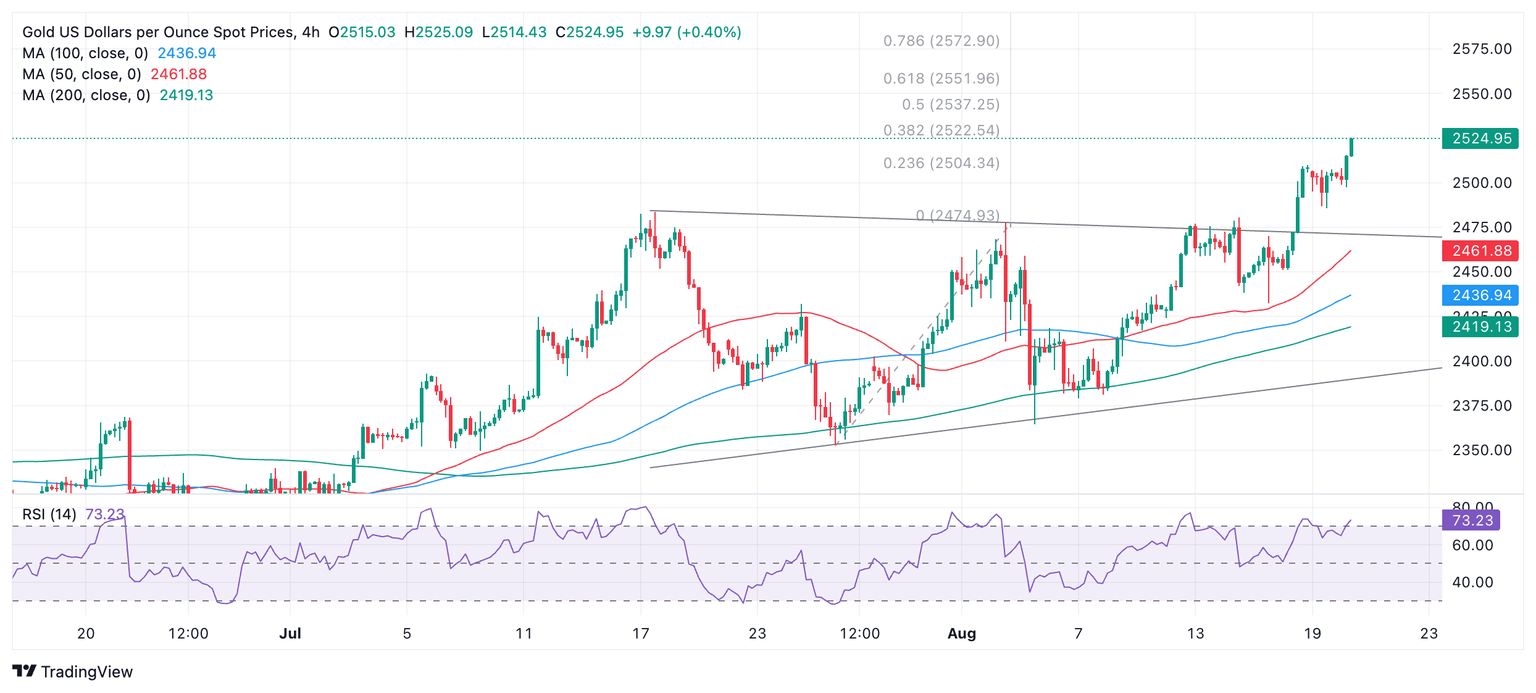El Oro (XAU/USD) se extiende a nuevos máximos históricos después de romper un rango en el que estaba atrapado desde julio. Está en camino hacia el objetivo inicial de la ruptura en 2.550$, calculado tomando el ratio de Fibonacci de 0,618 de la altura del rango y extrapolándolo hacia arriba.