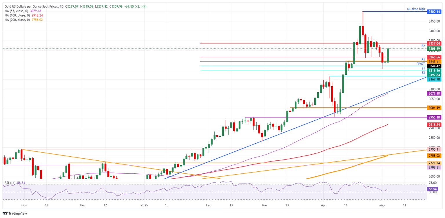 En el lado positivo, la resistencia R1 en 3.265$ ya ha sido superada en una prueba al alza en el inicio de la jornada de este lunes. Si hay un seguimiento, la R2 en 3.337$ podría estar un poco lejos. Más bien, busque 3.290$ (máximo del 1 de mayo) y 3.320$ (máximo del 30 de abril) como niveles intermedios cercanos para la resistencia al alza.