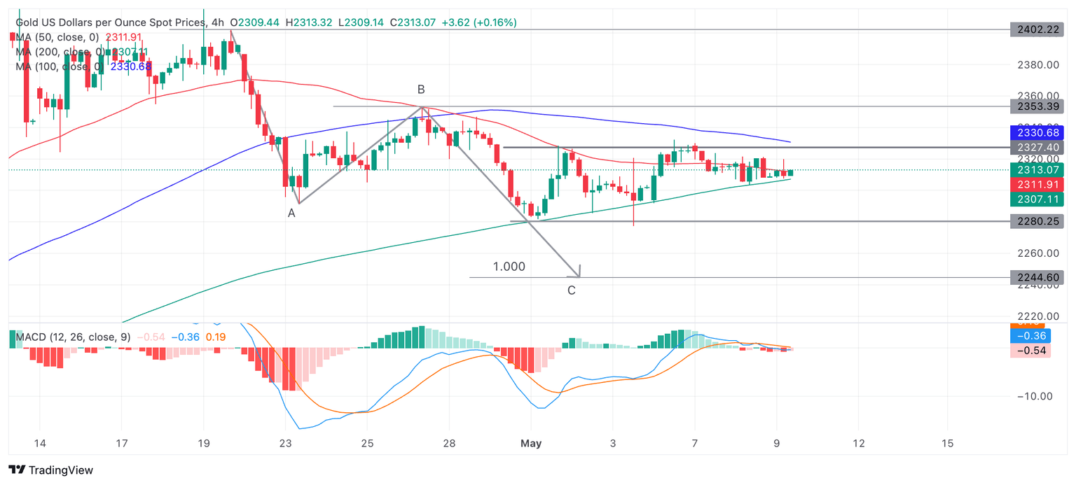 El precio del Oro (XAU/USD) ha vuelto a probar y ha retrocedido desde el techo de un mini-rango en torno a los 2.326 $. Actualmente está encontrando soporte tanto en la media móvil simple (SMA) de 200 como en la de 50 en el gráfico de 4 horas, en los 2.310 $.
