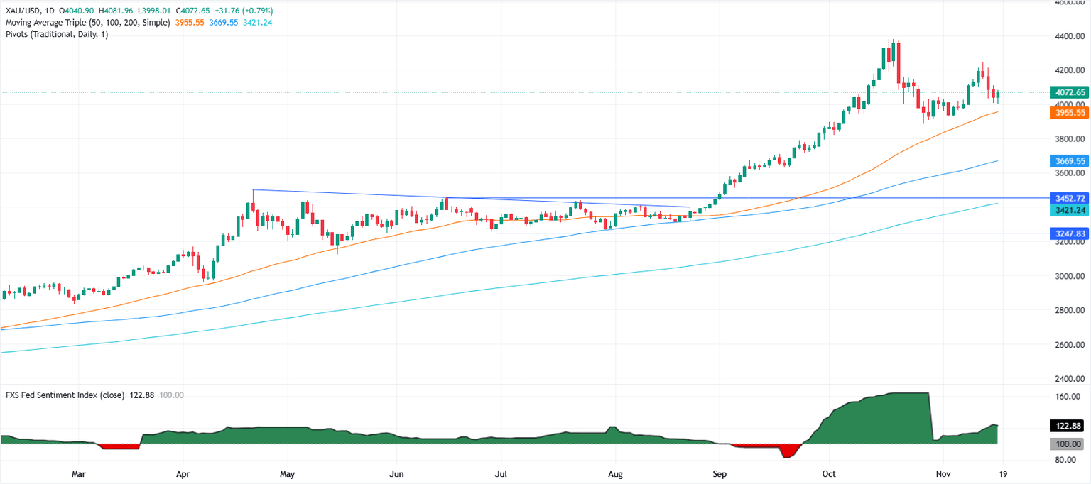 Sin embargo, un fracaso en mantener las ganancias por encima de 4.050$ dejaría al XAU/USD vulnerable a un retroceso hacia 4.000$, seguido de una posible prueba del mínimo del 28 de octubre cerca de 3.886$.