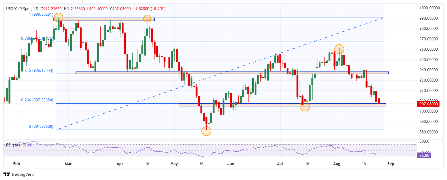 El USD/CLP firma su segunda sesión consecutiva a la baja y se mantiene operando cerca de mínimos de cinco semanas en 907.12. Este contexto está impulsado por la perspectiva bajista en el Índice del Dólar (DXY) después de las declaraciones de Jerome Powell en el simposio de Jackson Hole, donde menciono que un recorte de tipos de interés es inminente en septiembre.