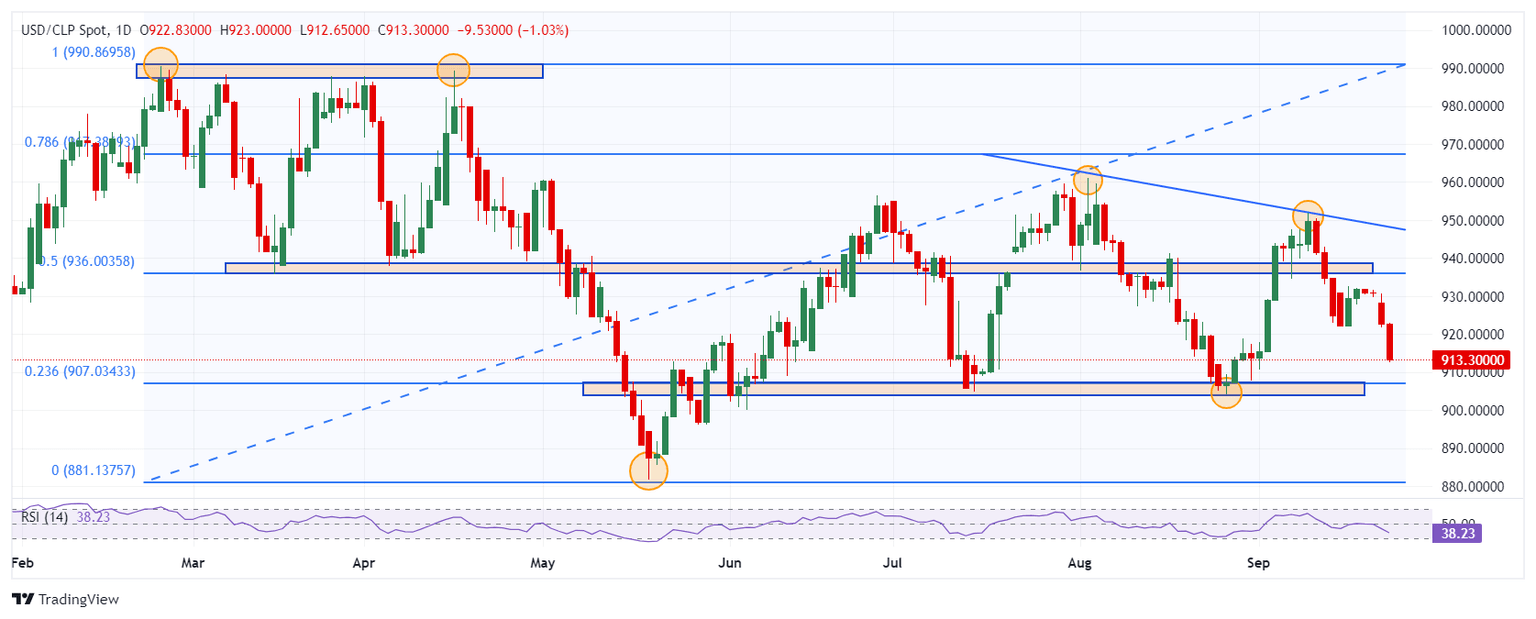 El USD/CLP estableció un máximo diario en 923.00, encontrando vendedores que llevaron la paridad a mínimos no vistos desde el 2 de septiembre en 912.65. Al momento de escribir, el Dólar estadounidense opera en 913.28 frente al Peso chileno, perdiendo un 1.04% diario.