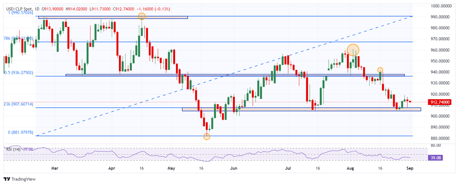 El USD/CLP marcó un máximo del día en 914.02, donde atrajo vendedores agresivos que llevaron la paridad a un mínimo del día en 911.73. Actualmente, el Dólar estadounidense se valora en 912.63 frente al Peso chileno, perdiendo un 0.14% el día de hoy.