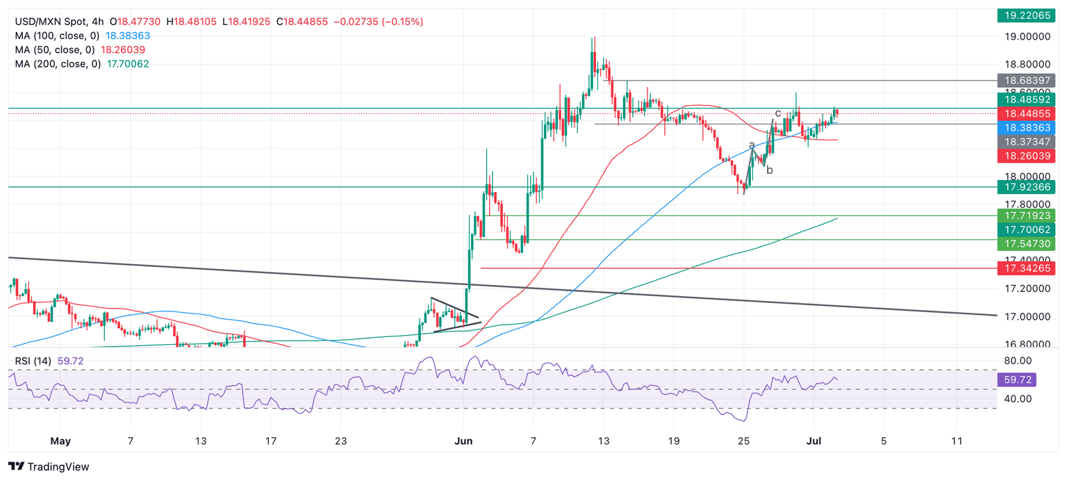 El USD/MXN logra continuar al alza después de retroceder desde su máximo del 28 de junio en 18,59 – ahora no está tan lejos, cotizando en 18,40.