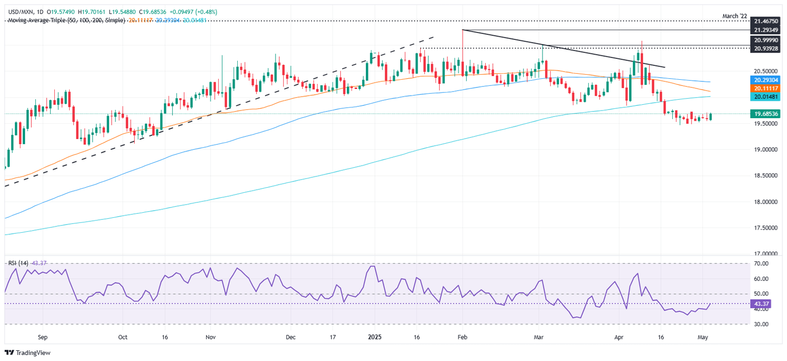 La tendencia a la baja del USD/MXN se mantiene intacta, pero parece que el par ha encontrado su pie, tocando fondo cerca del rango de 19.46–19.50, con los vendedores incapaces de empujar los precios a la baja. Los compradores están ganando impulso, como lo refleja el Índice de Fuerza Relativa (RSI); por lo tanto, una prueba de la SMA de 200 días en 19.98 está en el horizonte. Una ruptura de esta última expondrá la marca de 20.00, seguida por la SMA de 100 días en 20.26.