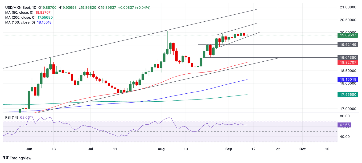 El USD/MXN está cotizando dentro de los límites de un mini canal ascendente, que a su vez se encuentra dentro de un canal ascendente más amplio que comenzó en abril.