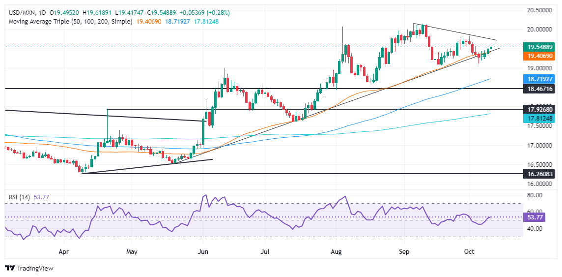 Perspectiva técnica del USD/MXN: El Peso mexicano amplía sus pérdidas mientras el USD/MXN salta por encima de 19.50