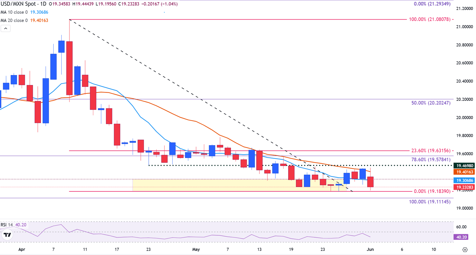 - El USD/MXN se dirige hacia el mínimo de mayo, consolidándose por debajo de 19.30.