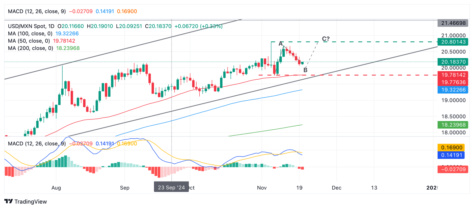 Después de eso, sin embargo, el USD/MXN probablemente extenderá una nueva etapa al alza en línea con sus ciclos más amplios, y esto podría ver los precios regresar a la zona entre 20.80 (máximo del 6 de noviembre) en una onda "C?" (línea discontinua verde) de un patrón de Movimiento Medido de tres ondas que podría estar evolucionando actualmente (ondas A, B y C?).