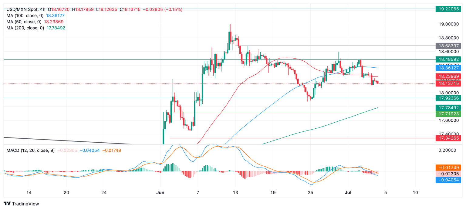 - El USD/MXN baja en un descenso escalonado hacia 18.00.