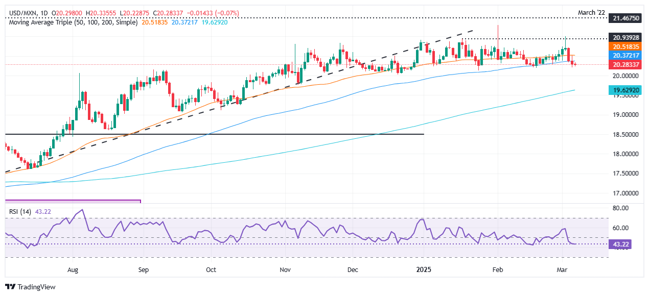 Si el USD/MXN supera la SMA de 100 días, la próxima resistencia sería 20.50. Si se supera, los siguientes niveles de resistencia clave serían el pico del 4 de marzo en 20.99 y el máximo del año hasta la fecha (YTD) de 21.28.